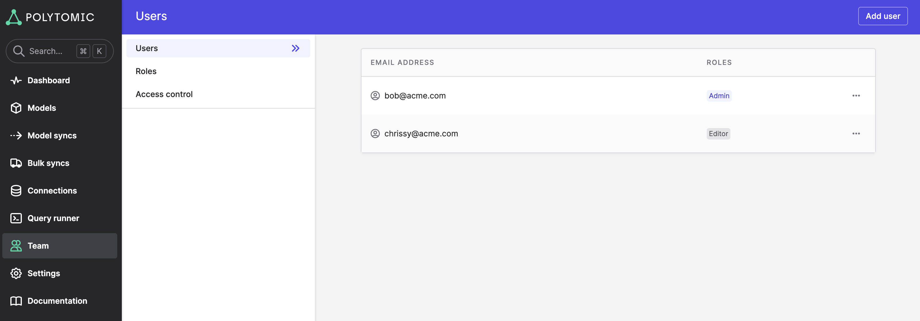 - Enter the email address of the team member you want to add then click Add user. The added user will receive an email notifying them of their addition to Polytomic.
