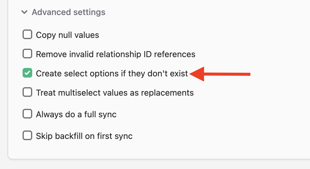 If instead you'd like Polytomic to write the source record regardless and only skip the relationship-setting, you can scroll down to Advanced settings at the bottom of your sync configuration and turn on the Remove invalid relationship ID references option: