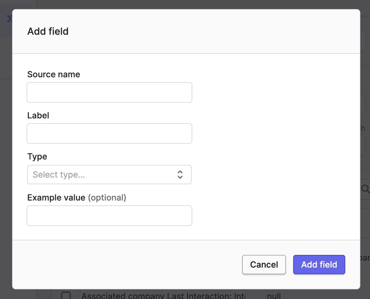 We can use this fact to add any fields from the related company to this model by adding a custom field whose source name is associated_company. followed by the desired field on the Company object. For example: associated_company.first_calender_interaction.interacted_at.