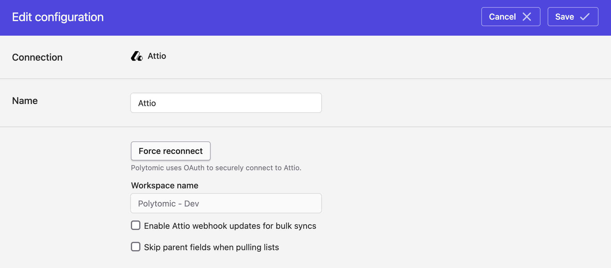 - Turn on Enable Attio webhook updates for bulk syncs if you want Polytomic to sync incrementally based on Attio's webhook updates, rather than doing a full sync every time. Note that there is a small chance that an update may be missed due to the nature of webhooks and their lack of delivery guarantees.