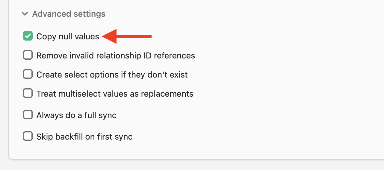 If you are writing null values to Attio fields, Polytomic's default behaviour is to not write them in place of existing values in your destination. To change this and write all null values to your destination, turn on the Copy null values option: