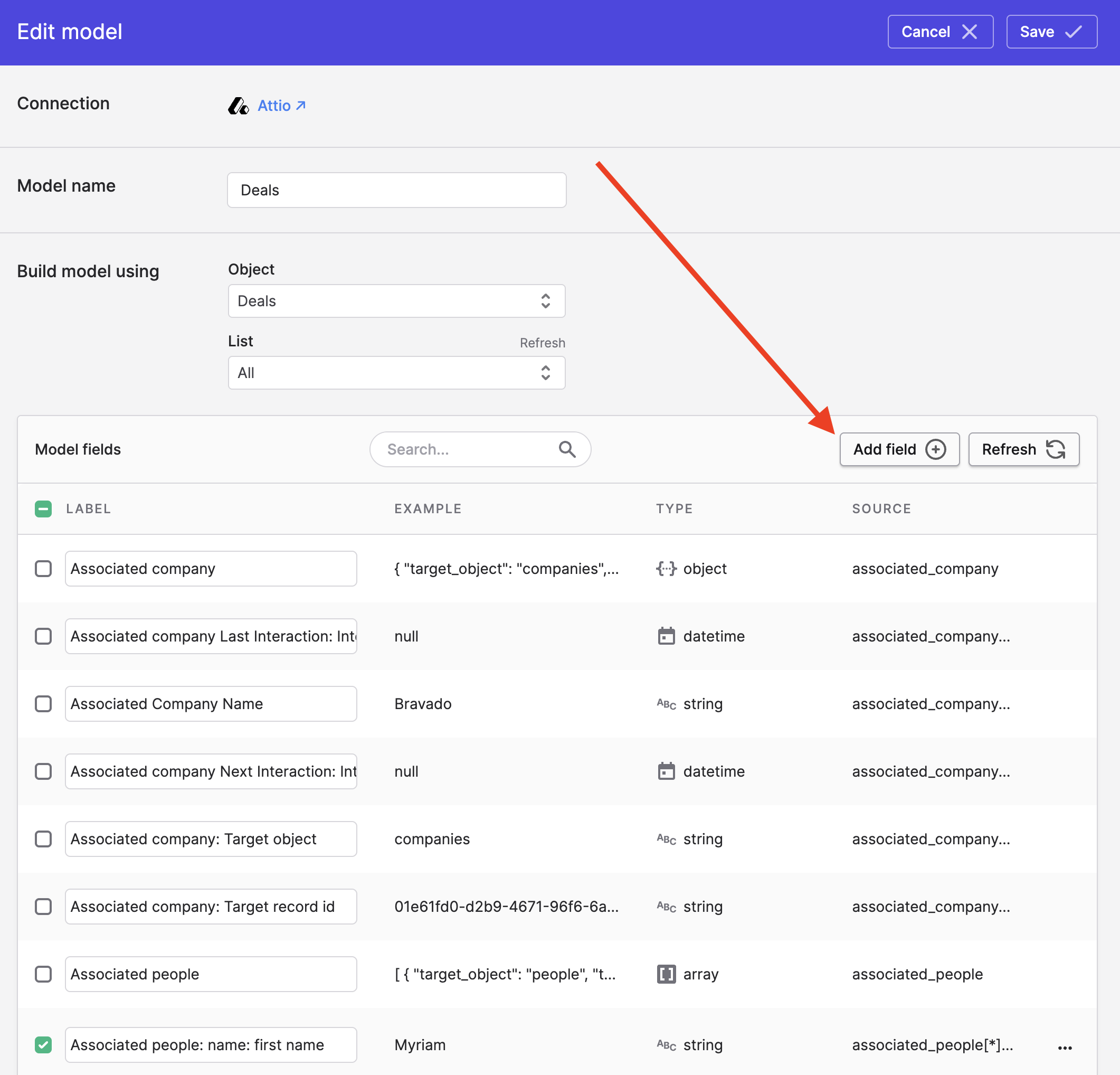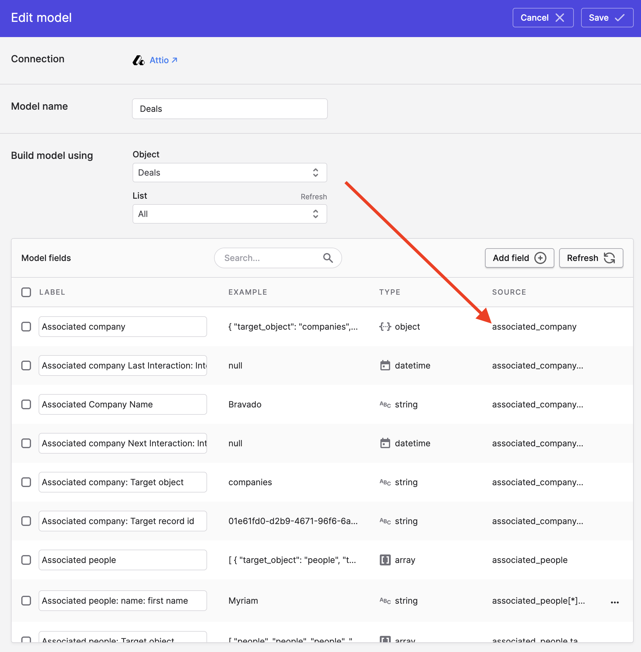 To add fields to a model from its related objects, you simply need to augment your JSONPath expression in the Source name field to refer to the related object field you desire. For example, consider how this Deals model has an associated_company object:
