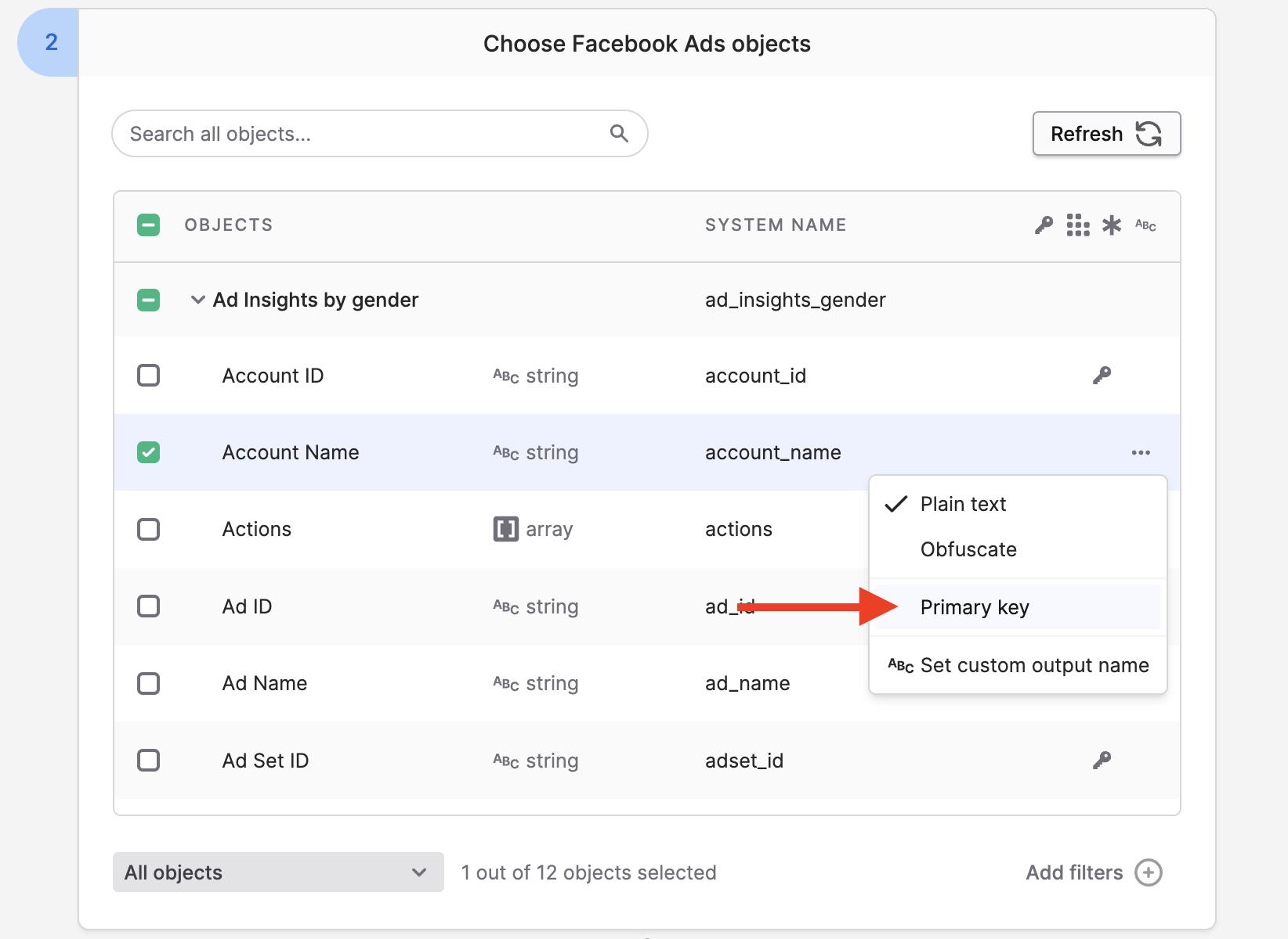 In these cases, you can set your primary keys for Polytomic to use and set in your destination data warehouse. You can do so by clicking on ... on the right of the fields you want to set, then clicking on the Primary key setting. You can set more than one primary key: