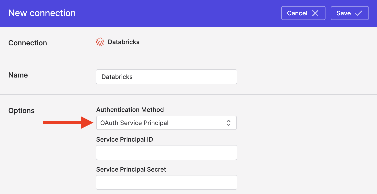 To use OAuth authentication, change your Authentication Method above to OAuth Service Principal: