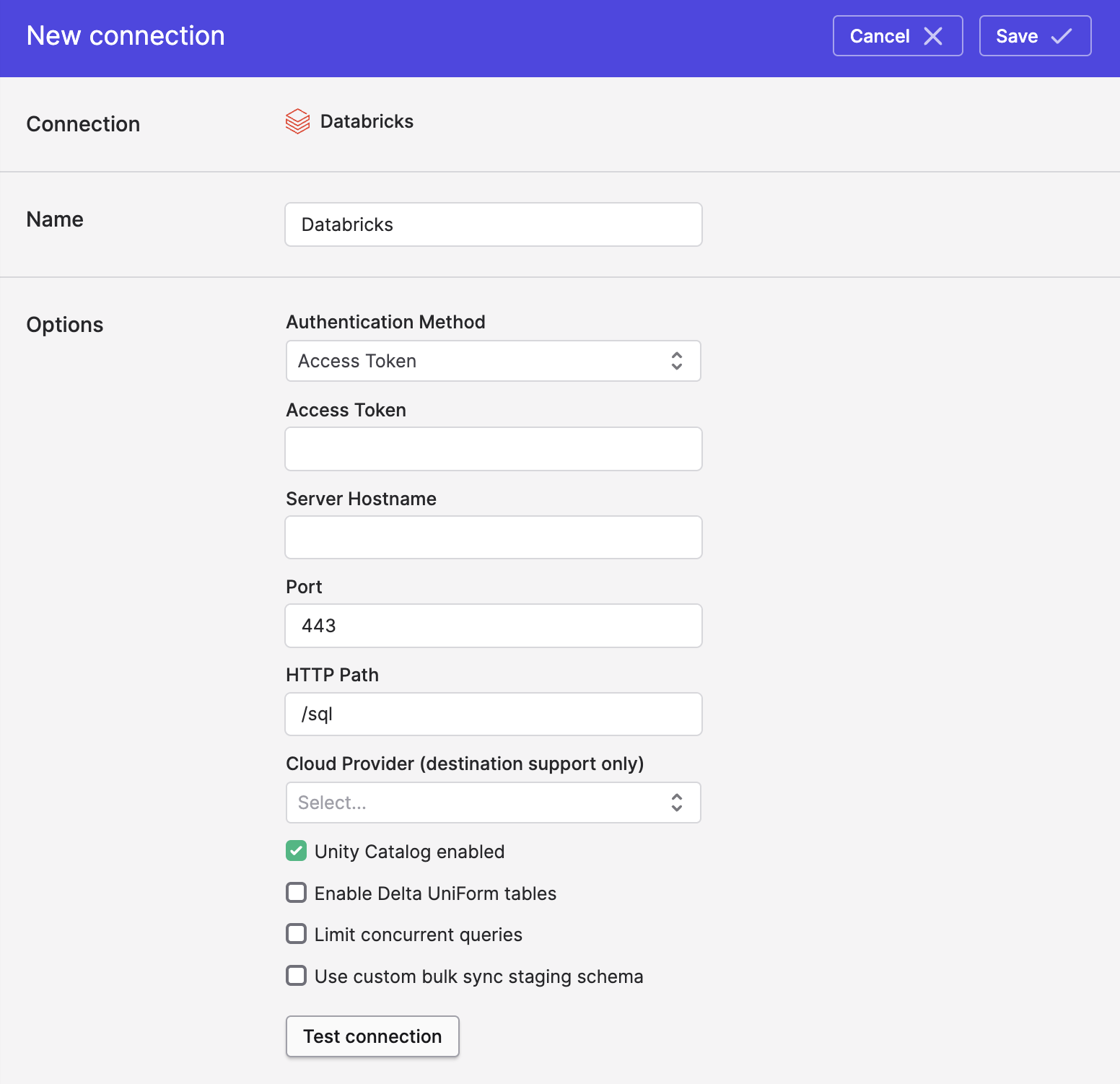 - In Polytomic, go to Connections → Add Connection → Databricks.