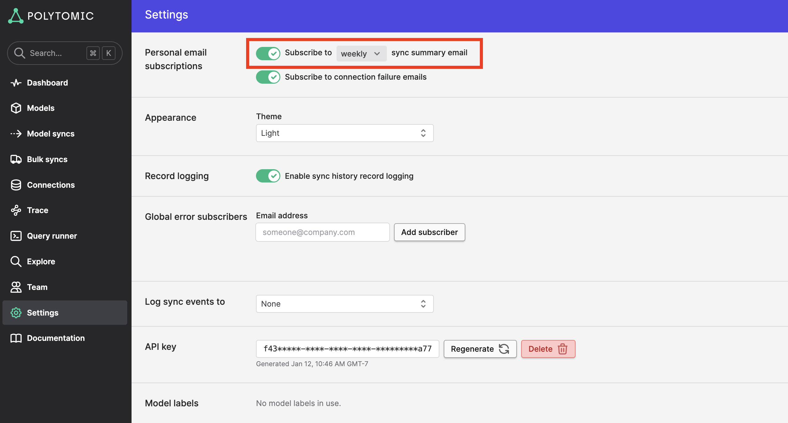 You can subscribe to an email digest of count statistics for all syncs in your workspace. This digest can be either daily or weekly. You can toggle your personal subscription by going to the Settings panel at https://app.polytomic.com/user: