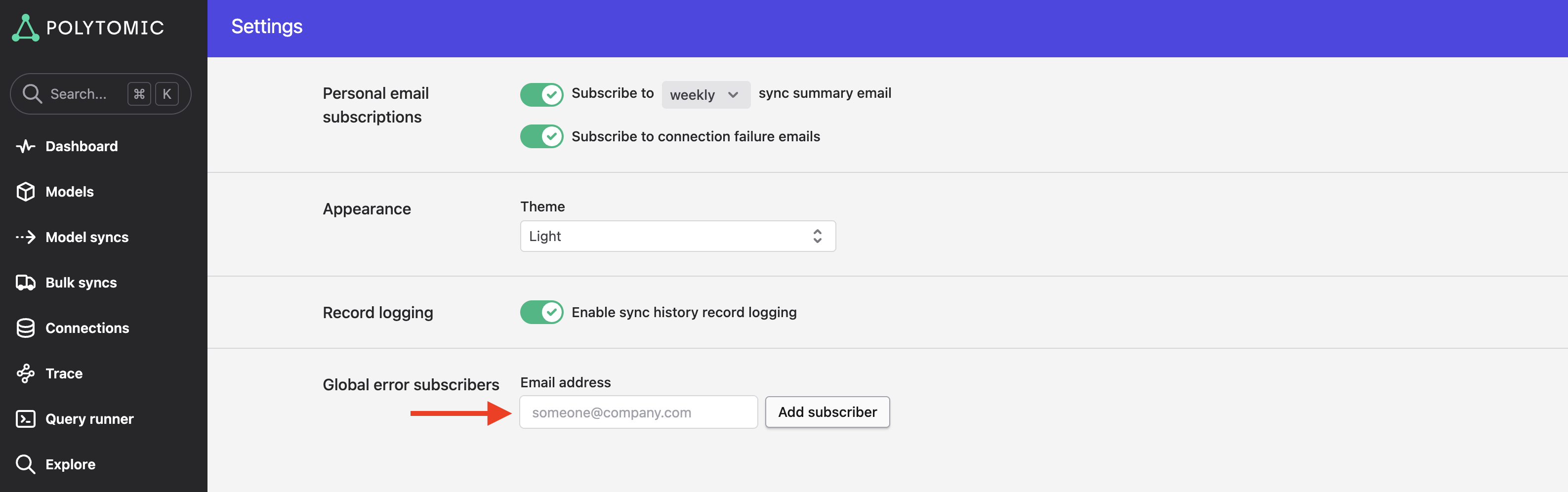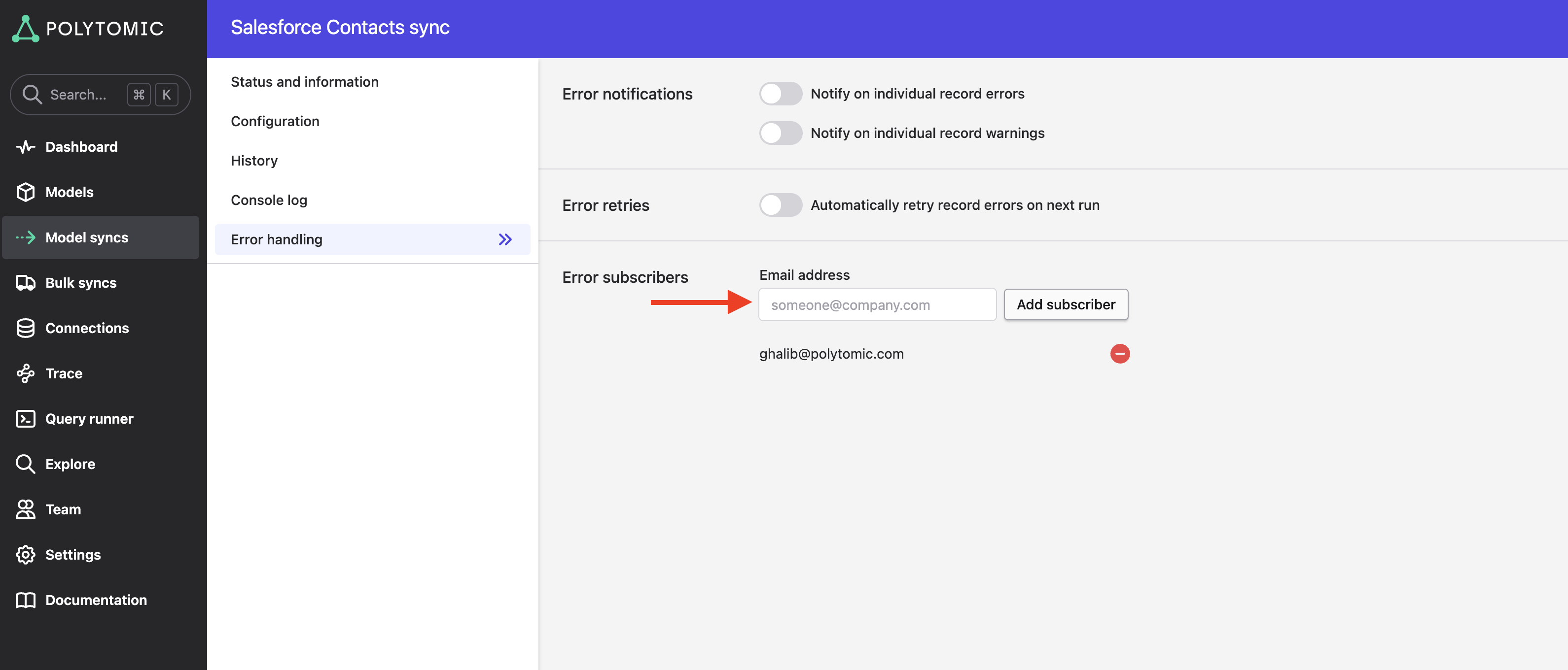 By default, each new sync created in Polytomic results in the creator user email address automatically being added to its error notification list: