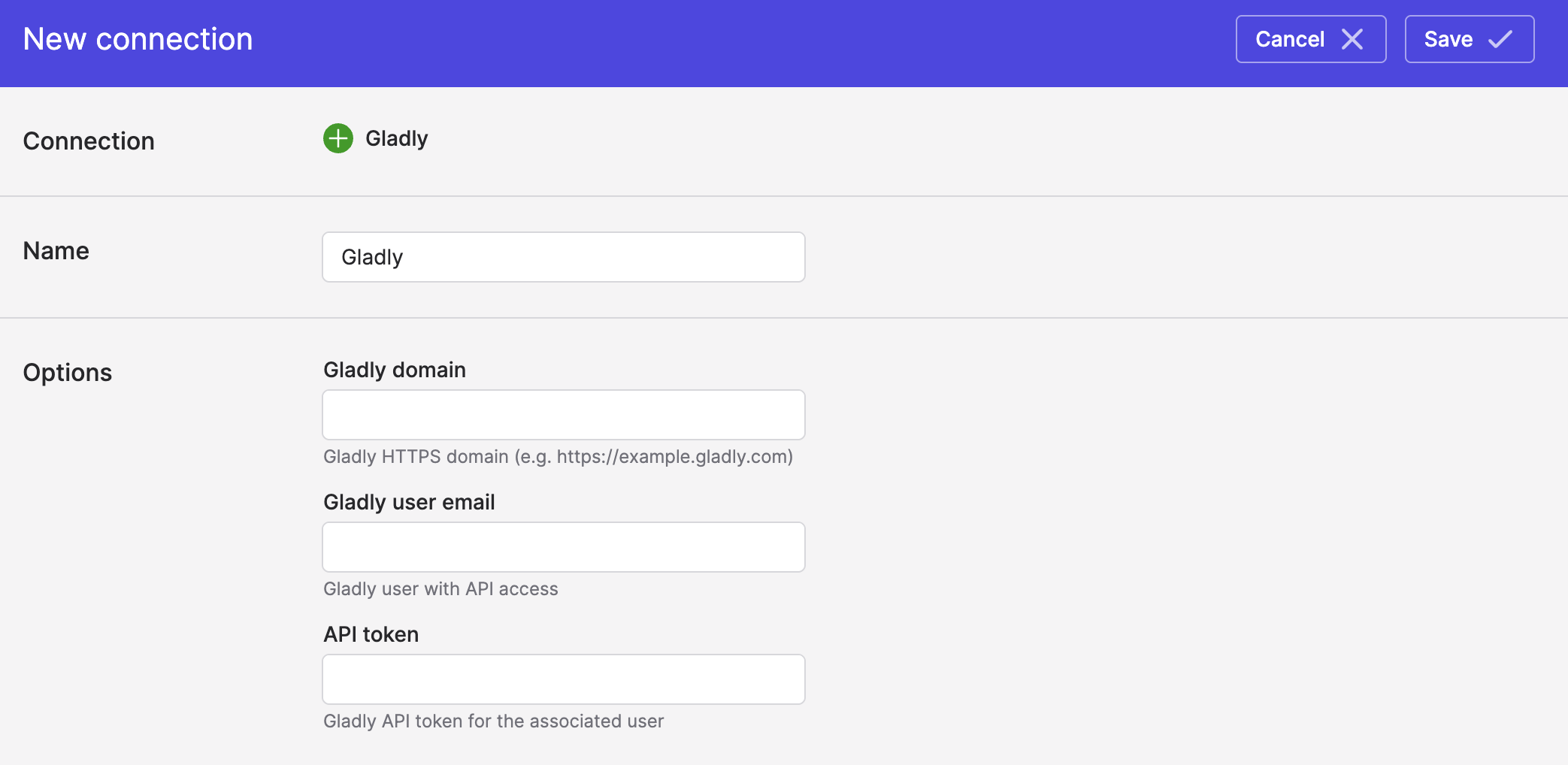 - Enter your Gladly domain, Glad user email address, and API token from Step 2: