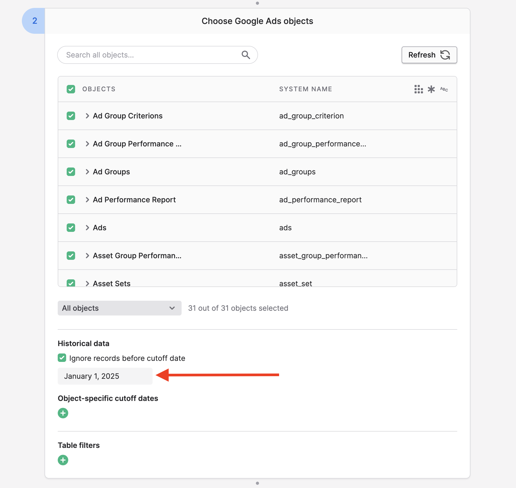 You can set a date cutoff for your Google Ads report tables to instruct Polytomic to only pull report data from after a certain date.