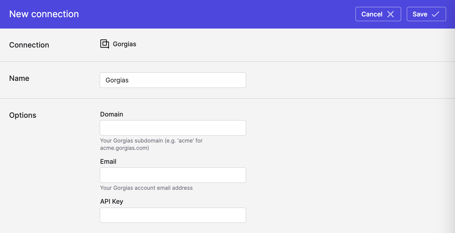 - Paste your Gorgias domain, user email address, and API key in Polytomic: