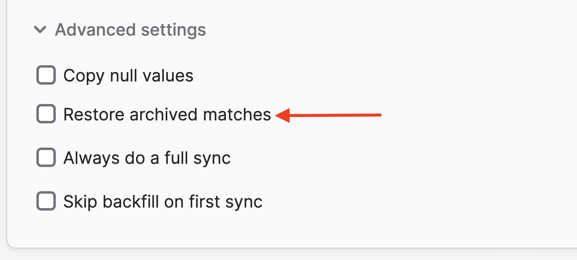 When syncing users to Intercom, Polytomic may match against user records that have been archived in Intercom. By default, Polytomic logs these as errors. If you would like Polytomic to restore archived users that it matches against, you can turn on this setting in the Advanced settings section of your sync configuration: