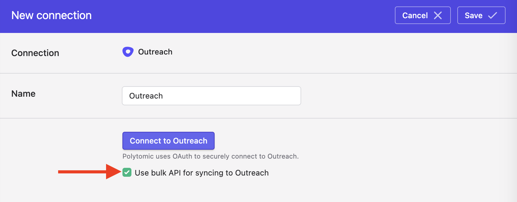 If you will often be sending over 250 record updates to Outreach on each sync run, you can speed up this process by ensuring that Polytomic is enabled to use Outreach's bulk APIs for sending it data (this will only apply when 250 or more records are sent to Outreach in one sync):