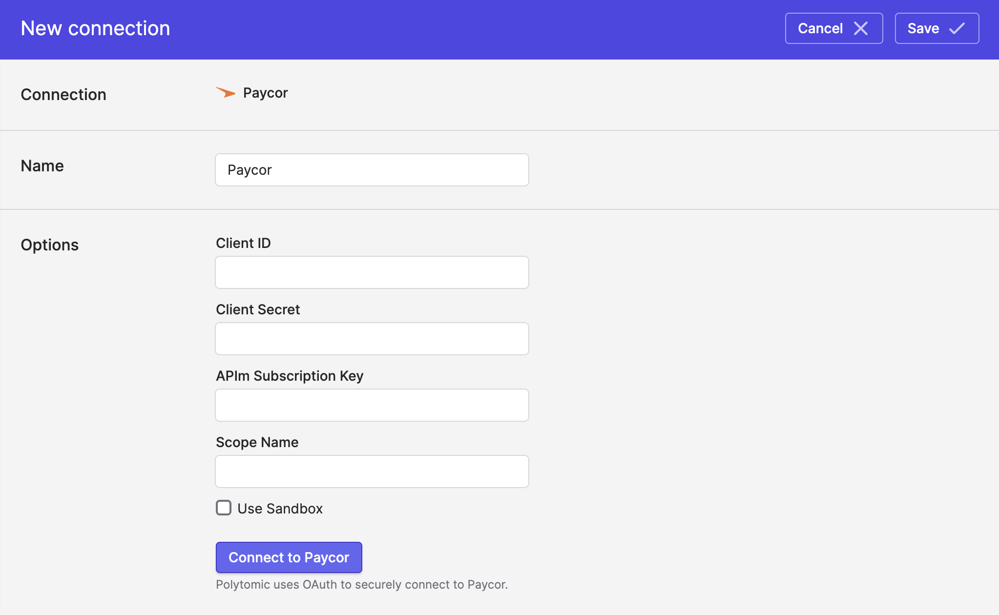 Now that you have credentials from Paycor, you will enter them in Polytomic: