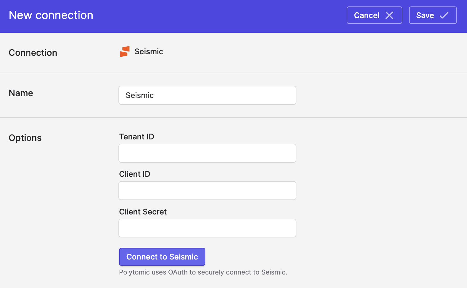 In Polytomic, go to Connections → Add Connection → Seismic.