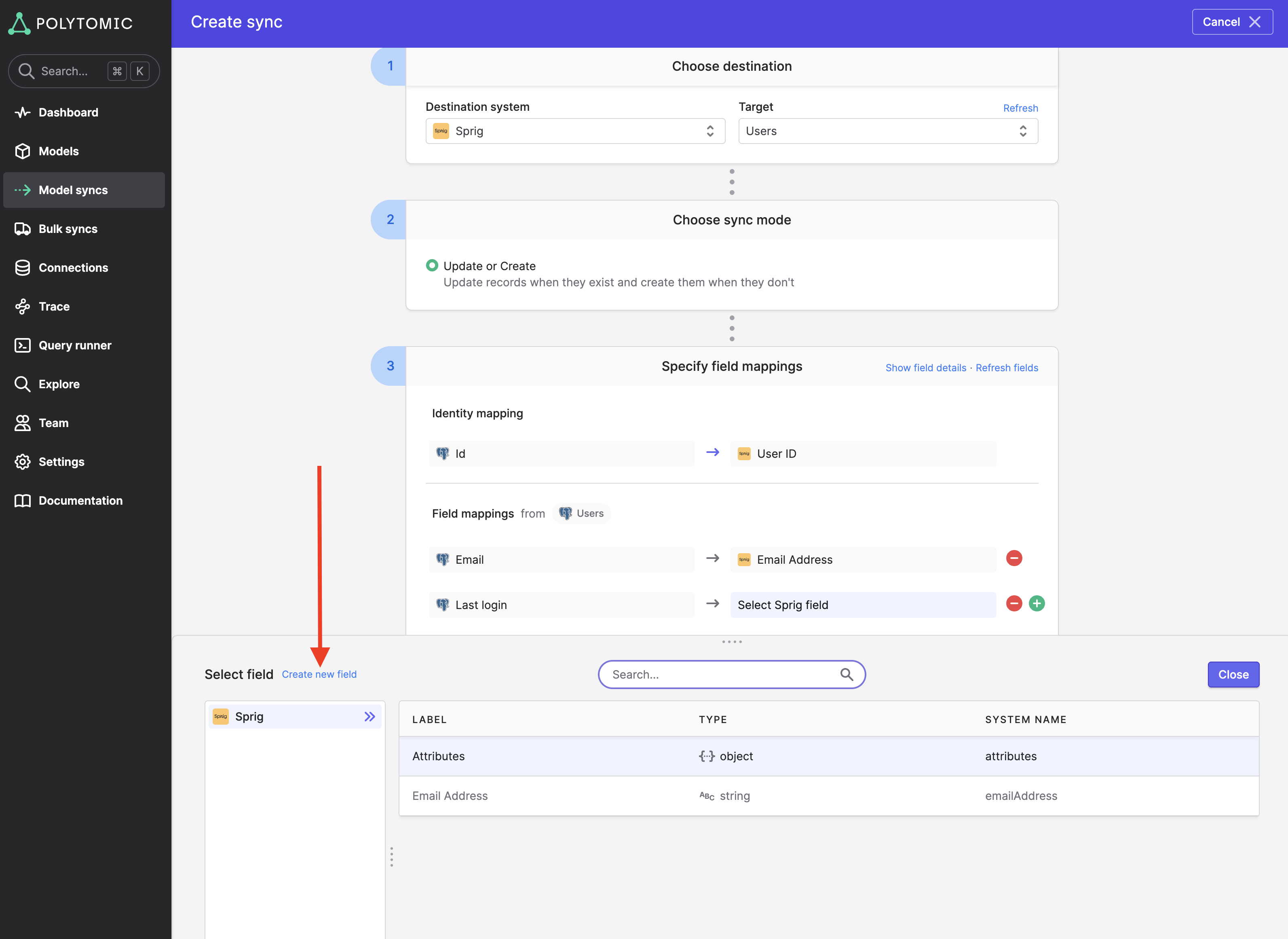 To do that, simply click on the Sprig destination field then click Create new field in the Polytomic field drawer that pops up. That will enable you to create a field with your chosen name on the Sprig user record: